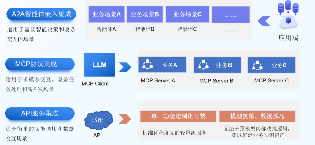 具体建设路径方面,可以按照高质量数据集建设-模型训练评测-智能体搭建-场景应用的智能应用构建工作闭环,利用自然资源行业大模型服务平台提供的系统工具链,打造自然资源场景应用智能化支撑能力,为新一代自然资源 “一张图”赋予一双“AI之翼”。而在业务系统智能化升级实施时,在应用侧集成模型服务通常可采取以下三种技术方案: