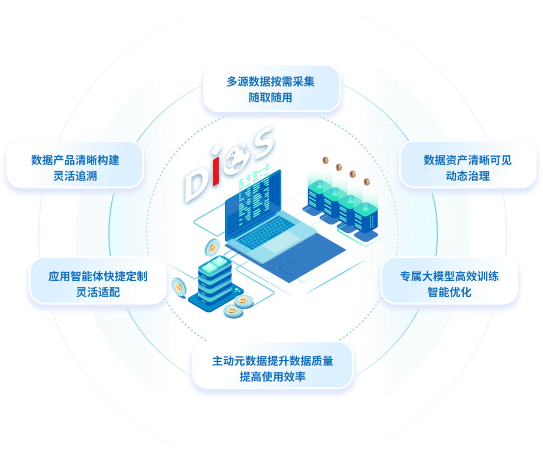 DIOS数智云脑是一个数据智能操作系统,它以业务为驱动,突破传统数据管理瓶颈,通过数据编织、数据网格等技术架构,提供即连即算、虚拟存储、智能编目和自服务编排等功能。
