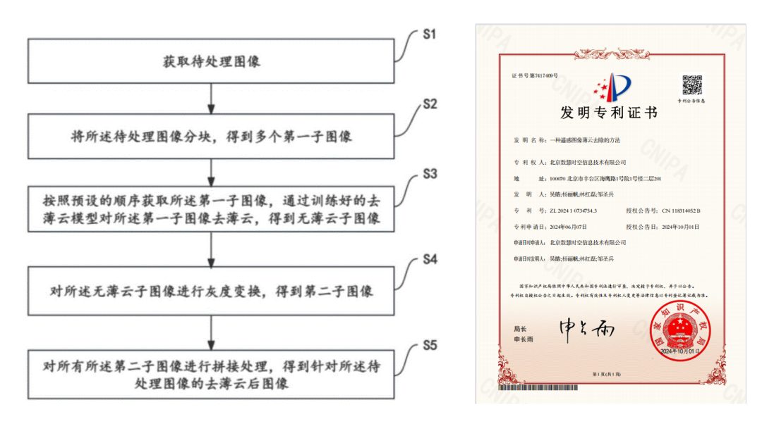 发明方法示意图/专利授权证书 遥感图像处理技术领域 1.专利信息 2.专利说明书摘要 本发明提供一种遥感图像薄云去除的方法,包括:将待处理图像分块,得到多个第一子图像,按照预设的顺序获取第一子图像,通过训练好的去薄云模型对第一子图像去薄云,得到无薄云子图像,对无薄云子图像进行灰度变换,得到第二子图像,对所有所述第二子图像进行拼接处理,得到针对待处理图像的去薄云后图像。本发明通过基于条件变分自动编码的去薄云模型对含薄云图像去除薄云,得到的无薄云图像纹理清晰,通过对无薄云子图像进行灰度变换,使得去薄云后的整幅图像灰度均衡。 3.创新点 本发明提供一种遥感图像的薄云去除方法,适用于高分辨率遥感图像,通过将单幅有薄云图像生成多个清晰的去薄云中间图像,能够得到高精确度的去薄云图像,同时通过灰度变换,使得去薄云后的整幅图像灰度均衡。 首先,利用基于条件变分自动编码的去薄云模型,建立有薄云图像到去薄云中间图像的一对多的映射,能够提高去薄云的精度,薄云去除干净,去薄云图像细节纹理清晰。其次,通过对无薄云子图像进行灰度变换,保证最终拼接后的整幅去薄云后图像的灰度均衡。然后,通过按照预设的顺序进行去薄云,使得去薄云顺序和灰度变换的顺序对应一致,从而使去薄云处理过程和灰度变换处理过程可同步进行,减少等待时间,提升效率。 4.痛点问题 遥感图像中的薄云通常呈现半透明状态,相较于受厚云污染的影像,受薄云污染的影像仍保留部分地物信息,因此可以通对影像去除薄云,以提高影像利用率。由于受薄云污染的影像中通常还包含部分地表结构和颜色信息,因此去除薄云任务的重点在于如何实现地表结构信息和颜色信息的精细恢复。 目前的薄云去除方法主要针对的是低分辨率的遥感影像,当其应用到高分辨率、大尺寸的遥感影像中时,薄云去除效果差、效率低。相关技术中基于单幅有薄云图像恢复出去薄云图像,由于仅使用有薄云图像来恢复,导致无法获得精确到像素的清晰图像。此外,相关技术中虽然存在对于大尺寸遥感影像进行分块去薄云的方法,但是,将分块处理后的影像重组为整幅图像时,图像存在灰度不一致问题。 数慧时空遥感云脑DIEY依托多模态基础大模型“长城”,采用云原生、大数据、深度学习、知识图谱等新一代信息技术,构建国产化、自动化、智能化、业务化的遥感数据处理及应用服务框架,打通从原始卫星影像数据获取到行业应用的全链条生产工序。 目前,本项发明专利已成功应用到DIEY影像智能统筹管理系统当中,并成功服务于自然资源部及吉林、广东、宁夏、新疆等客户单位。系统集成了数据入库、影像质检、质检修复、智能统筹、智能预测等内容。针对原始影像存在的质量问题,系统依据相关行业标准与规范,设置多项质检规则,建立质检多模态大模型,实现对海量、多源影像数据进行定性化和定量化的高效、快捷自动化质检。同时支持模型在本地的自进化和迭代。 自动化质量检查:支持对光学原始卫星影像的薄云、薄雾、曝光、以及RPC文件,进行定量化和定性化的检查和分析。 影像质量修复:可对薄云、薄雾、半阴影等可修复问题进行自动修复。对不可修复的问题进行自动预测。 系统基于薄云等去除技术和影像统筹策略,可将云量在20%-80%的数据变废为宝,提高监测区域影像覆盖率,解决南方地区在梅雨季节影像无法覆盖的问题,具有广阔的应用前景。